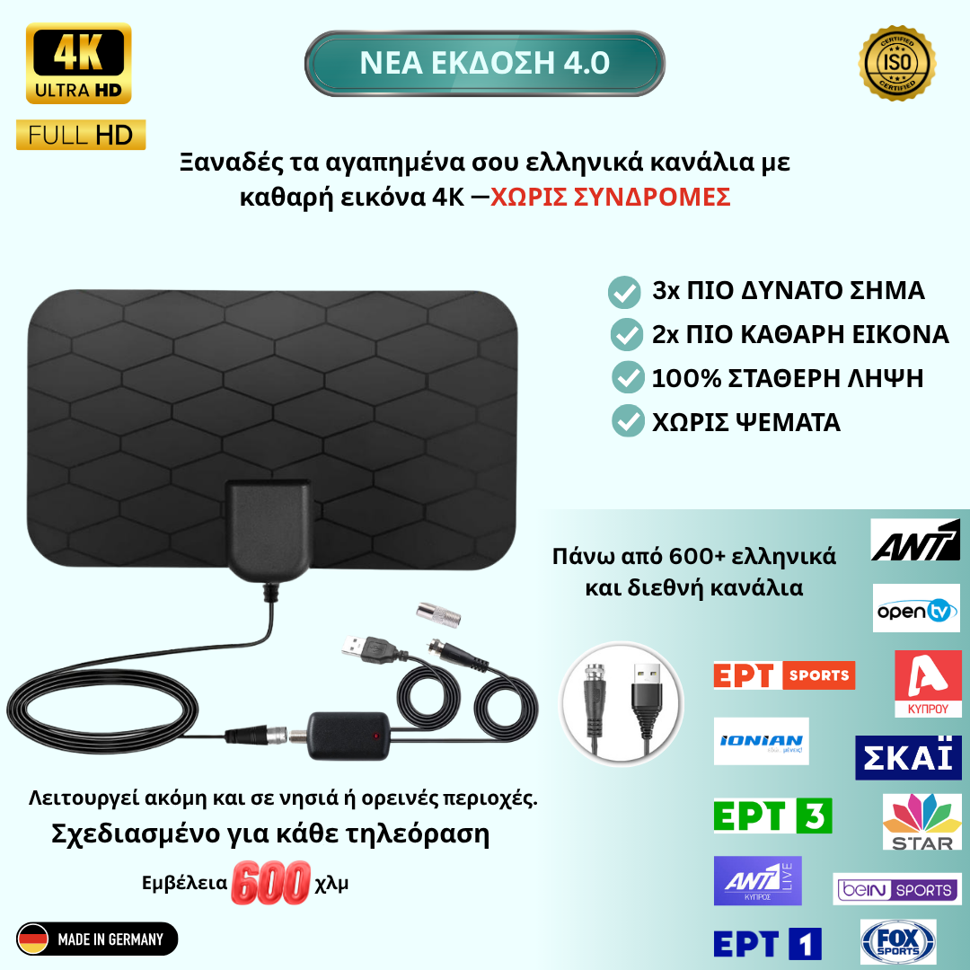 Μπορεί να πιάσει πάνω από 100 ελληνικά και διεθνή κανάλια (ειδήσεις, σπορ, σειρές, ταινίες, ντοκιμαντέρ) με κρυστάλλινη ποιότητα 4K, χωρίς παρεμβολές ή διακοπές.